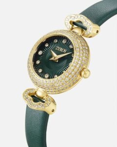 - ميناء الساعة باللون الأخضر يتزين بعدد من فصوص الزركون اللامعة